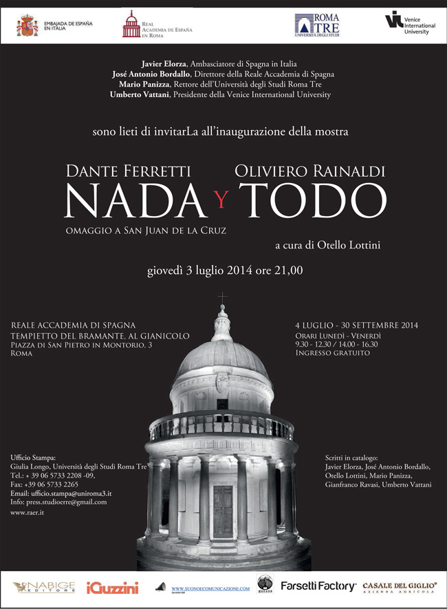 Per la prima volta a Roma un evento unico, nella sede dell'Accademia di Spagna, nella sua suggestiva sede sul Gianicolo, inaugura il 3 Luglio la mostra Nada y Todo, all'interno del rinascimentale Tempietto del Bramante. La mostra presenta i lavori dell'artista Oliviero Rainaldi e dello scenografo Dante Ferretti. Per la prima volta questa location si trova a dialogare con l'arte contemporanea, grazie alla volontà dell'Università Roma Tre di realizzare un progetto scientifico fortemente sostenuto dal Rettore, l'architetto Mario Panizza. Il grande punto di partenza, dal quale prende le mosse la mostra, è il pensiero filosofico di San Giovanni della Croce, poeta mistico del Cinquecento e nello specifico è la sua dottrina del "Nulla e Tutto" a dare il titolo alla mostra curata da Otello Lottini. Qui, infatti, i lavori di Oliviero Rainaldi, sono inseriti per esplicitare e sintetizzare il pensiero mistico, reinterpretandone l'esperienza. L'artista designa 3 sculture a rappresentare la sua visione del percorso mistico filosofico e Dante Ferretti realizza tre opere luminose che ne esaltano e ne enfatizzano il significato. Le opere si inseriscono rispettivamente tra lo spazio esterno del tempietto, nel colonnato e all'interno della cappella, tre sculture di tre diversi materiali posizionate in tre luoghi del tempietto, aiutando, così, il visitatore a percorrere il cammino di purificazione attraverso cui l'uomo giunge ad affrancarsi dalla vita terrena.